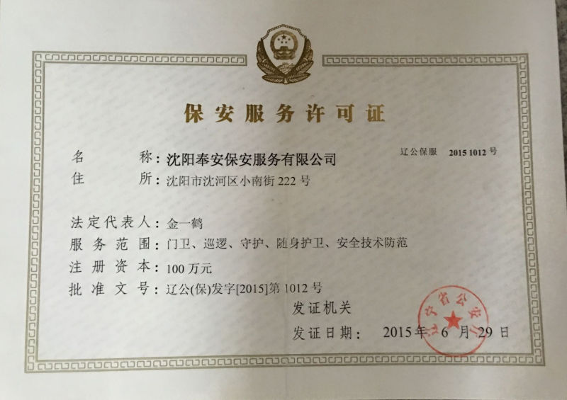 沈陽(yáng)奉安保安服務(wù)有限公司(原沈陽(yáng)市沈河區(qū)保安服務(wù)公司)創(chuàng)建于一九八八年八月,是遼寧省公安廳、沈陽(yáng)市公安局批準(zhǔn),工商行政部門(mén)登記注冊(cè),全市首家具備保安資質(zhì)的特殊性服務(wù)企業(yè),隸屬于沈陽(yáng)市沈河區(qū)政府直管的全民國(guó)有企業(yè),現(xiàn)為中國(guó)保安協(xié)會(huì)會(huì)員單位和省保協(xié)、市保協(xié)常務(wù)理事單位:在全市同行業(yè)中率先通過(guò)ISO國(guó)際質(zhì)量認(rèn)證,是市工商局批準(zhǔn)的“重合同守信用”免檢單位和沈陽(yáng)市政府采購(gòu)中心保安服務(wù)項(xiàng)目重點(diǎn)競(jìng)標(biāo)單位;擁有一支專(zhuān)業(yè)化、標(biāo)準(zhǔn)化、職業(yè)化的高素質(zhì)保安隊(duì)伍,是公安機(jī)關(guān)重要的輔警力量。